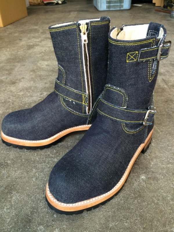 お世話になっている靴木型職人さんからの2足目のオーダーはなんとBT-05のジーンズ仕様!ご自身でジーンズ生地はお持込ですがガッチリ仕上げて欲しいとのご要望で2.5mm厚のラフアウト牛革にジーンズを貼り更に1.2mmの牛革ライニングで仕上げました。またジーンズ生地にイエローステッチが効いてますね!同じ業界の職人さんにも大変ご満足頂け私も思った以上の出来栄えに嬉しく思いました。
